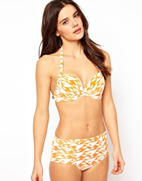 You can go as skimpy as you like up top, but choose suits that have their prints or embellishments on the top rather than the bottom, like ruffles or beading.